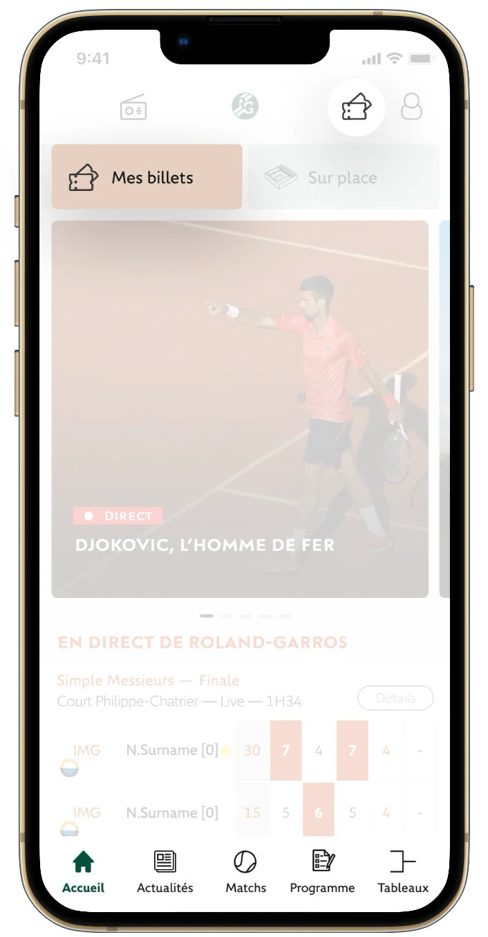 Le QR code et votre numéro de place s’affichent dans l’app. Présentez-les aux contrôles pour accéder au stade et au court indiqué. Bonne session !